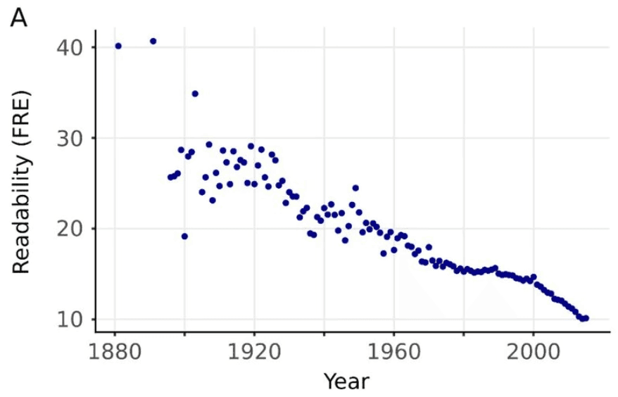 When they plotted readability over time, the pattern was not subtle. The scores drift downward across the decades, meaning scientific writing has steadily become more difficult to process.
